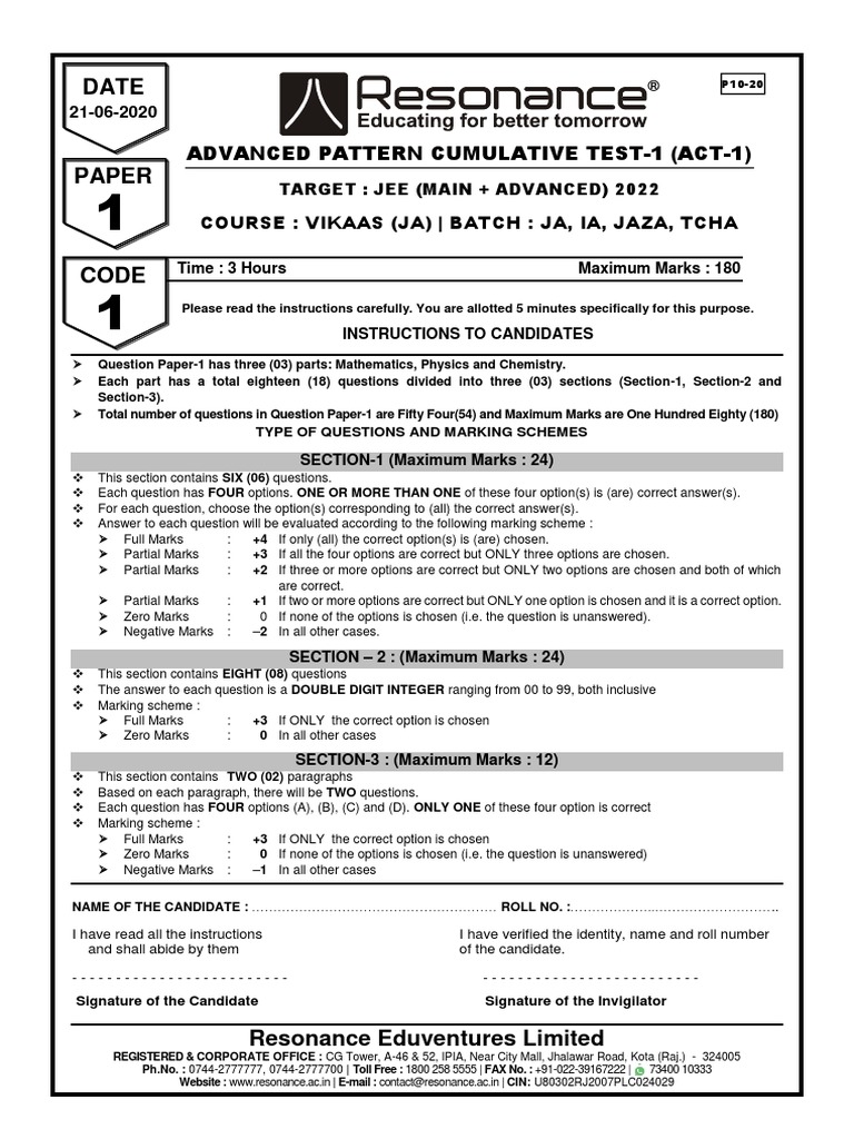Advanced Pattern Cumulative Test 1 Act 1 Paper 1 Pdf Electromagnetic Radiation Photoelectric Effect